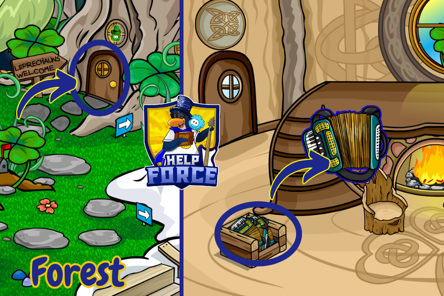 If you’ve ever wanted to own an accordion, now’s your chance! Head to the Forest and enter the Leprechaun’s House (the tree on the right with a sign pointing to it that says “Leprechauns Welcome.”)